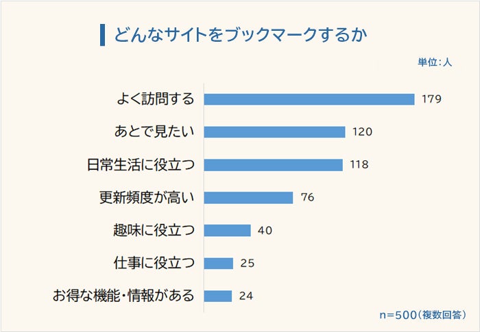 「どんなサイトをブックマークするか?」という問いには、「よく訪問するサイト(179人)」と回答した人が最も多くなりました。2位「あとで見たいサイト(120人)」、3位「日常生活に役立つサイト(118人)」が続きます。