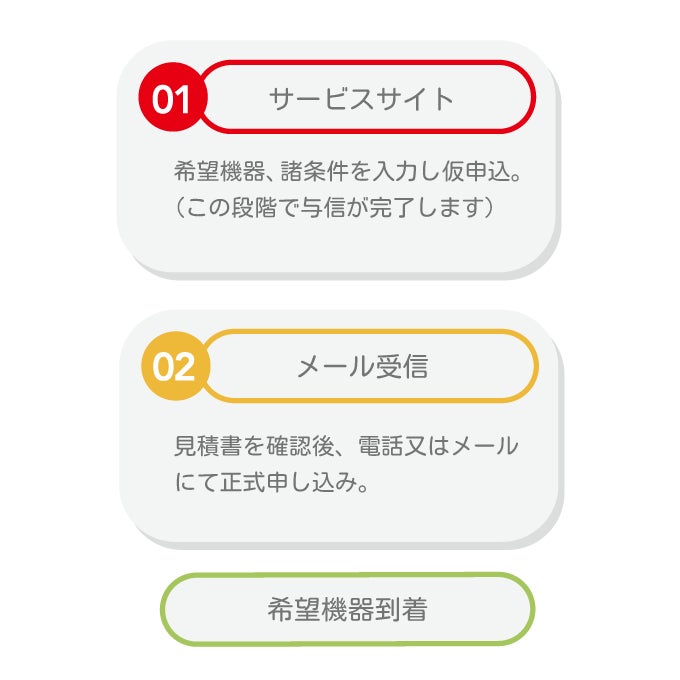 実際の機器の利用まで簡単な2ステップ(ウェブサイトで完結)で完了します。希望する機器などの諸条件を入力すると「自動概算見積もり機能」により参考月額価格(新品、中古それぞれを表示)を算出します。その後、到着する見積書を確認の上、申し込みを完了すると機器が納品されます。