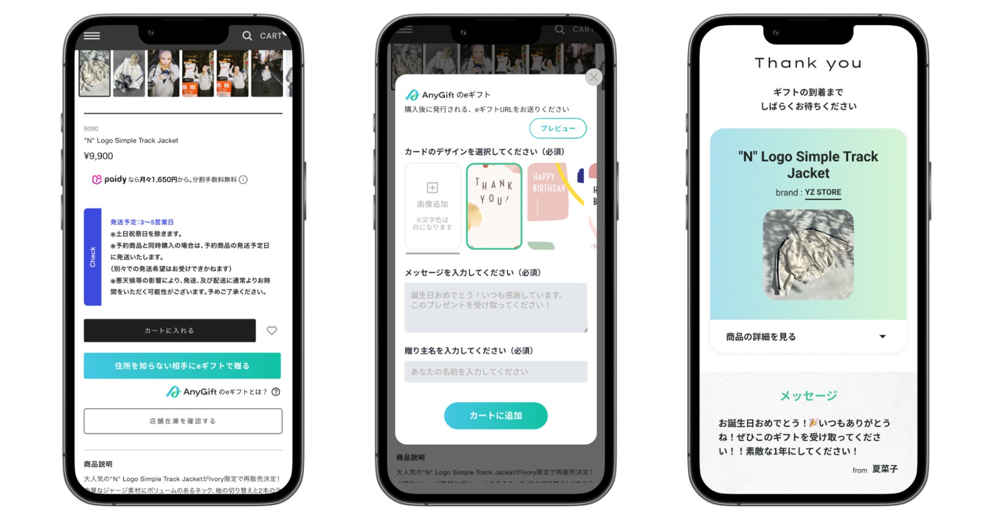 今回、当社のAnyGiftの提供により「YZ STORE」「PAMM」のオンラインストアにて人気のアパレル商品がeギフトとして贈れるようになります。