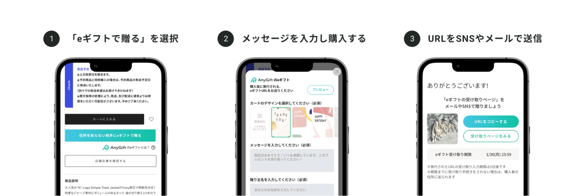 AnyGiftは、相手の住所を知らなくてもLINEやメールで贈ることができる"eギフト機能"を、ECサイトに組み込むことができるサービスです。