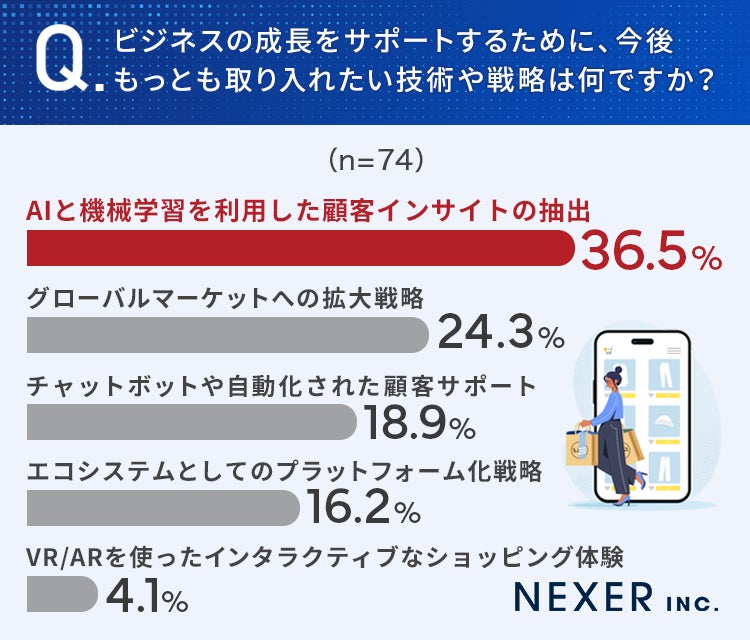 ECサイト経営の経験者に調査してみたところ、36.5%がの方が「AIと機械学習を利用した顧客インサイトの抽出」を取り入れたい、と回答しています。
