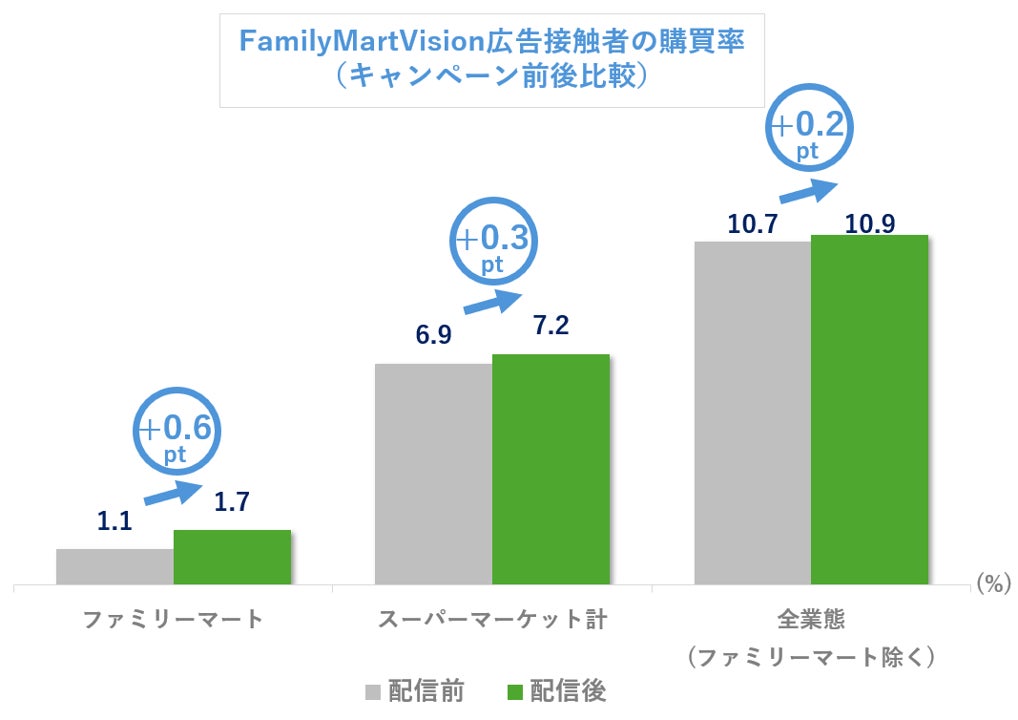 この検証の結果、FamilyMartVisionの広告に接触させることで、ファミリーマートにおける購買だけでなく、他販売チャネルでも購買を促進できることが確認され、FamilyMartVisionでの広告施策は異なる販売チャネルを横断した全体的な売上上昇への寄与が可能であることがわかりました。