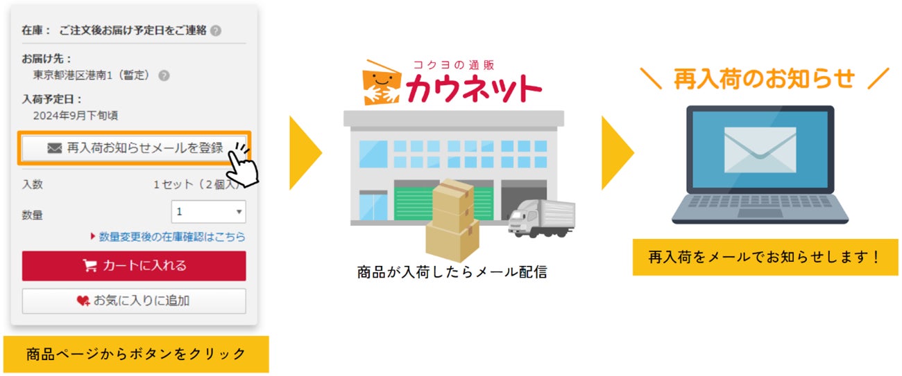 カウネットはこれまでも、商品在庫の有無およびお届け予定日を商品ページで確認できる機能(*1)を整備し、UX(ユーザー・エクスペリエンス)向上に努めてまいりました。今回の「入荷お知らせメール」新機能実装に併せて、お客様が欠品中商品について代替商品を検討、もしくは再入荷をお待ちいただくなど、お客様の購入判断に有益となる欠品中商品の再入荷の見通し等に関する情報もご案内できるようになりました。