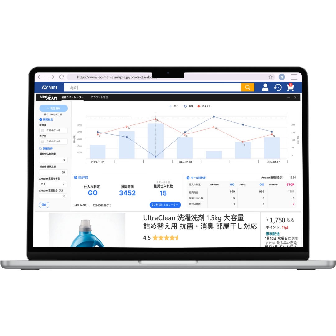 この度、当社がこれまで蓄積したデータ基盤を活用し、より多くのお客さまのお悩みを解決したいという考えのもと、仕入れ業務に特化したサービス「Nint仕入れ」を開発しました。調査したい商品のモール(楽天市場・Amazon・Yahoo!ショッピング)商品ページにアクセスしてからわずか数秒で、商品の購買判断および適切な数量および価格を「Nint仕入れ」が提案します。データ基盤は「Nint ECommerce」と共通のものを利用しているため、これまで経験と勘、定性情報で判断していた仕入業務を、データドリブンな形へとリードします。JANコード情報がある商品については、3つのモール情報を基に提案することも可能です。