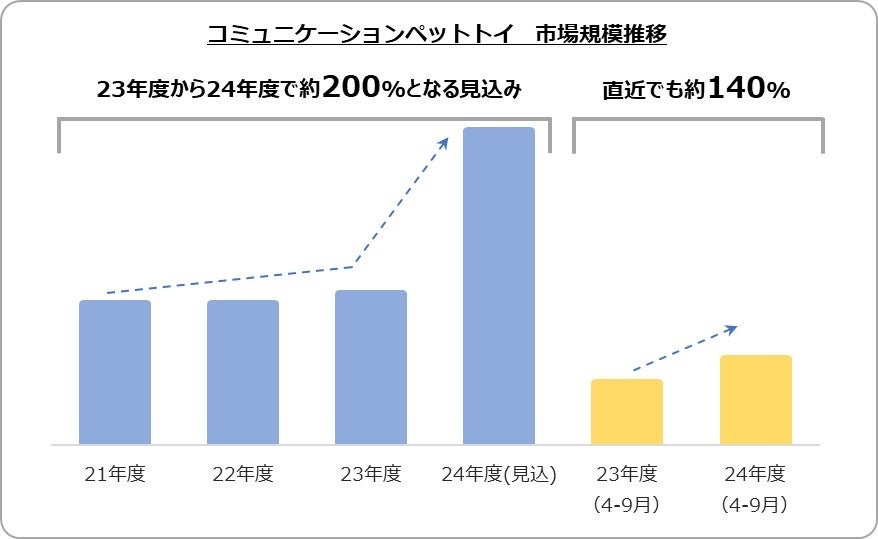 音声、光、動きなどの機能を持ち、話しかけたり、さわったりすると応答するペットトイのニーズが、コロナ下の巣ごもり需要で広がりました。今年は複数のメーカーから大型の商品が発売され、市場金額が大きく伸長すると予想しています。直近の2023年4-9月及び2024年4-9月の比較では前年度比140%に拡大しており、2023年度から2024年度にかけては前年度比200%に拡大すると見込んでいます。