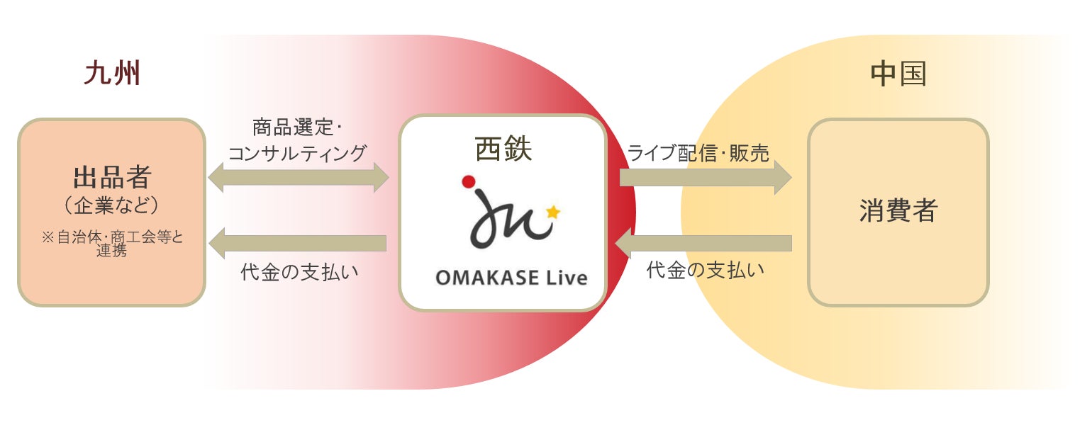 『OMAKASE Live』 では、世界有数の市場規模を有し、ライブコマースの先進国である中国のユ ーザー(消費者)へ、福岡・九州の自治体や企業の優れた商品を販売します。取引に必要な業務 は当社が一気通貫で請け負うほか、本サービスの専属ライバー(KOL※2)が自治体・企業と中国ユ ーザーの間に立ち、双方とのコミュニケーションを図りながら地域や商品の魅力を伝えるサポートを 行いますので、中国向けの販路や実績を持たない自治体や企業も安心してご利用いただけます。