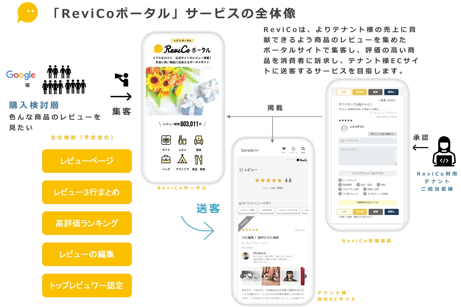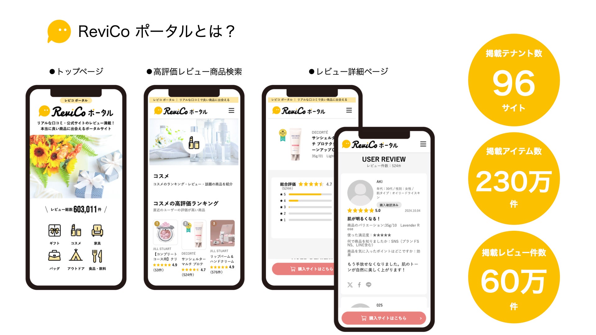 レビューマーケティングプラットフォーム「ReviCo」を提供する株式会社ReviCo(本社:東京都渋谷区、代表取締役:高橋直樹)は、「ReviCo」を活用してレビューマーケティングを行っている各企業様の公式サイトに集まったレビューを集約するサイト「ReviCo ポータル」を正式オープンしたことをお知らせいたします。