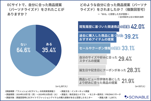 さらに、提案を受けたことがある方に、その内容を伺ったところ、最も多かったのが「閲覧履歴に基づいた関連商品の提案(42.0%)」で次いで「過去の購入品に基づくおすすめアイテム(39.2%)」、「セールやクーポン情報の提示(33.1%)」という回答が続きました。