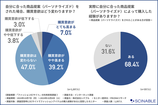 「自分に適した商品提案を受けた場合、購買意欲はどう変わるか?」との質問に対しては「購買意欲がとても高まる(7.0%)」「やや高まる(39.2%)」「変わらない(47.0%)」「やや低下する(3.8%)」「低下する(3.0%)」との結果が得られました。