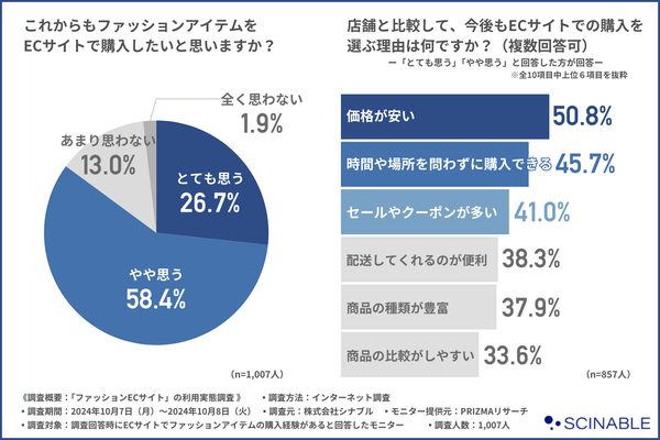 「店舗と比較して、ECサイトでの購入を選ぶ理由は?」という問いには、「価格が安い(50.8%)」、「時間や場所を問わず購入できる(45.7%)」、「セールやクーポンが多い(41.0%)」という結果が得られました。