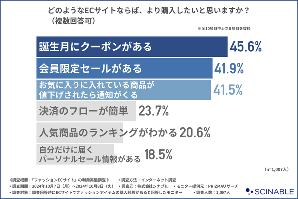 最後に、「どのようなECサイトならより購入したいか?」との質問の結果、最も多かったのは「誕生月にクーポンがある(45.6%)」で、次いで「会員限定セール(41.9%)」「おきにいり商品が値下げされた場合通知がくる(41.5%)」という回答がありました。