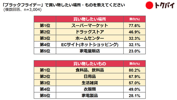 「ブラックフライデー」での購入希望スポットについては、「スーパーマーケット」が77.6%と最も高く、次いで「ドラッグストア」が46.9%、そして「ホームセンター」が32.3%という結果になりました。このイベントがECサイトから実店舗に広がりを見せていることが実証されています。