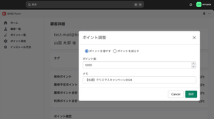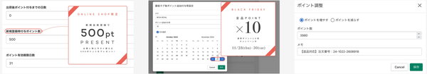 特定顧客のポイントを手動で調整できる機能を搭載。ポイントプレゼントキャンペーンや返品によるポイント取り消しなどのシナリオにも対応している。