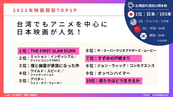 台湾の映画市場は、興行収入や動員数が安定して成長しており、日本の映画が特に人気を博しています。2023年に台湾で公開された映画の中で、日本作品が最も多く、興行収入においてもアメリカに次いで日本が第2位を獲得しています。日本のアニメ映画『THE FIRST SLAM DUNK』が年間の興行収入ランキングで第1位に輝き、『すずめの戸締まり』や『君たちはどう生きるか』もトップ10に名を連ね、日本映画が多くの観客を魅了しています。