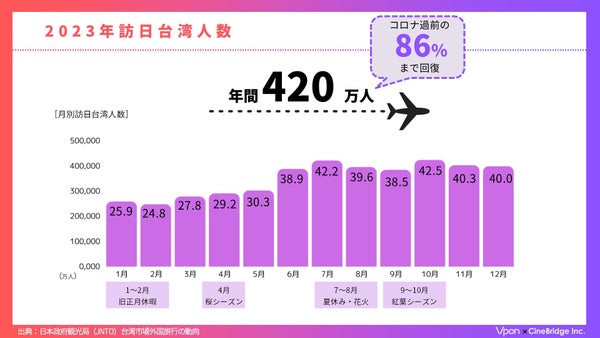 コロナ以前、台湾からの日本への訪問者数は年々増加し、2019年には約489万人に達しました。2023年の訪日者数は約420万人に回復しており、外国からの旅行消費においては台湾がトップの7,786億円を記録しています。これは日本旅行の依然として高い人気を示しています。