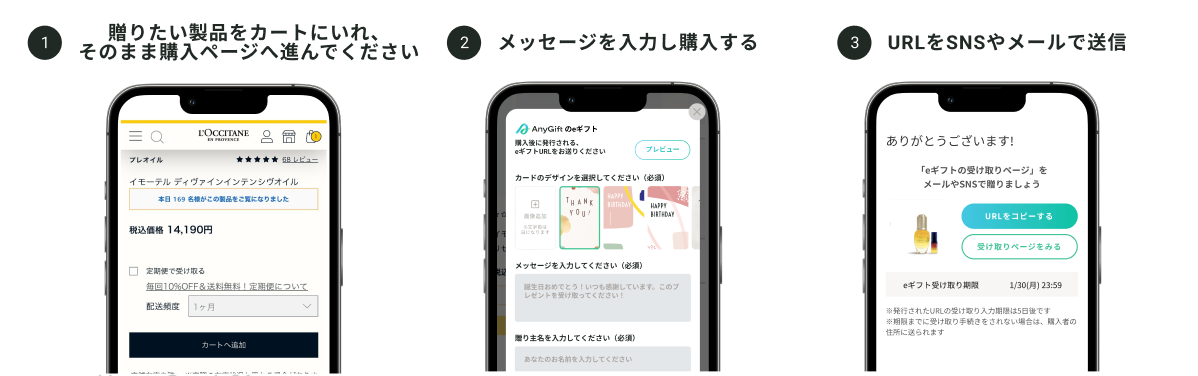 これにより、相手の住所を気にせず簡単にロクシタンの商品を贈ることができます。注文後すぐに発行されるURLを利用して、気軽に贈り物をすることが可能です。