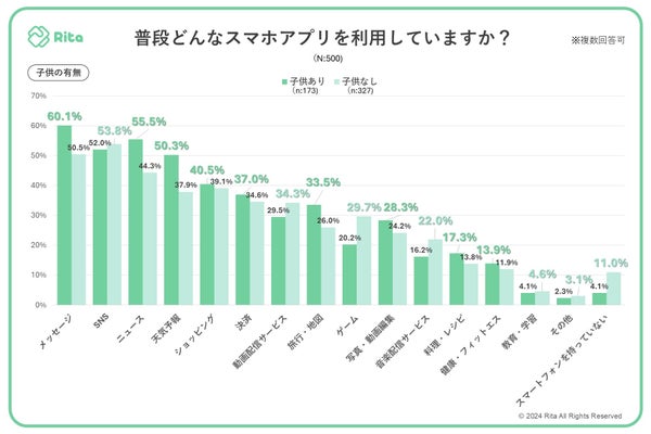 子供の有無での利用状況において最も大きな差が見られたのは「天気予報」で、子供のいる家庭は約14%高いという結果に。また「ニュース」においても、子供がいる家庭は10%以上の増加を示し、子供に影響を与える可能性のある出来事を把握するためにニュースアプリを利用する傾向が強いようです。