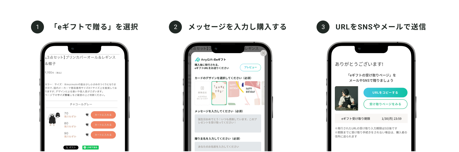 3) 購入が完了すると、eギフトの受け取りURLが発行されます。このURLをLINEやメール等で転送することで、お好きな相手にギフトを贈ることができます。