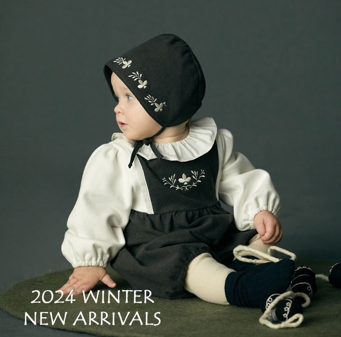 トーンダウンカラーの帽子がセットとなったカバーオールセット。レイヤード風のデザインと刺繍によるポイントが高級感を漂わせており、プレゼントにも最適なアイテムです。