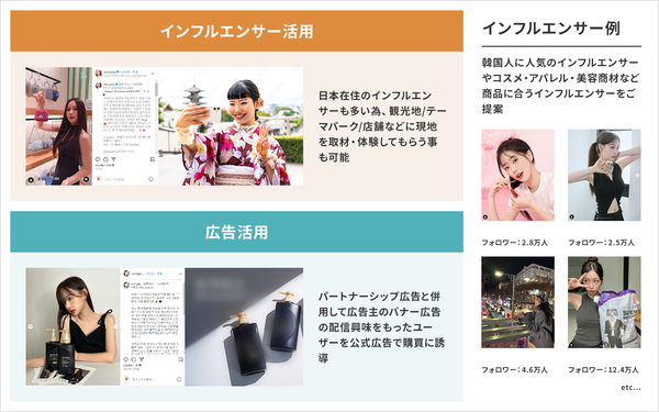 クロスアイ社との提携により、コスメ、アパレル、美容商品、観光など幅広い分野において、韓国の人気インフルエンサーがSNSを通じて日本製品の魅力を伝えるキャンペーンが実施されます。ターゲット市場に適したインフルエンサーを提案し、訪日中の韓国人旅行者の購買促進およびブランド認知の向上を図ります。