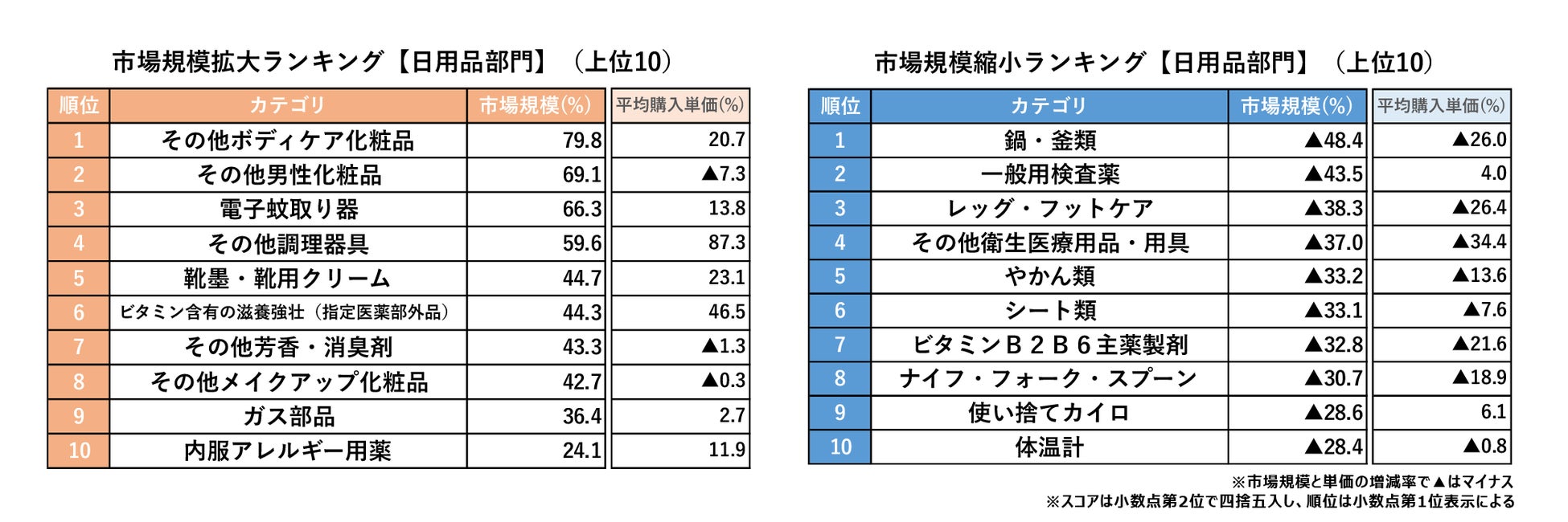 - 日用品部門では「ボディケア化粧品」が1位に選ばれ、前年比79.8%の大幅増加を見せました。特に「ダヴ クリーミースクラブ」が牽引役となり、SNSでの注目が購買を後押ししています。