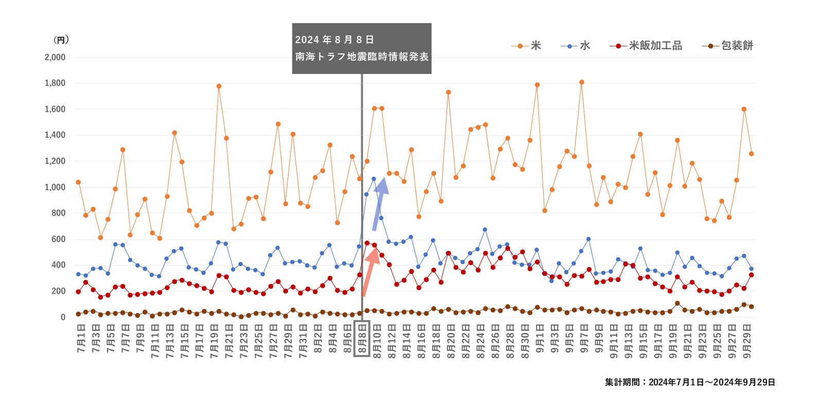 さらに、食品部門の「米」と「米飯加工品」、5位の「包装餅」、および「水」の購入金額を日々観察すると、南海トラフ地震の臨時情報が発表された8月8日以降に「水」や「米飯加工品」の購入額が急増した傾向が見られます。今後の災害への備えとして購入が進んでいることが明らかです。【図表3】