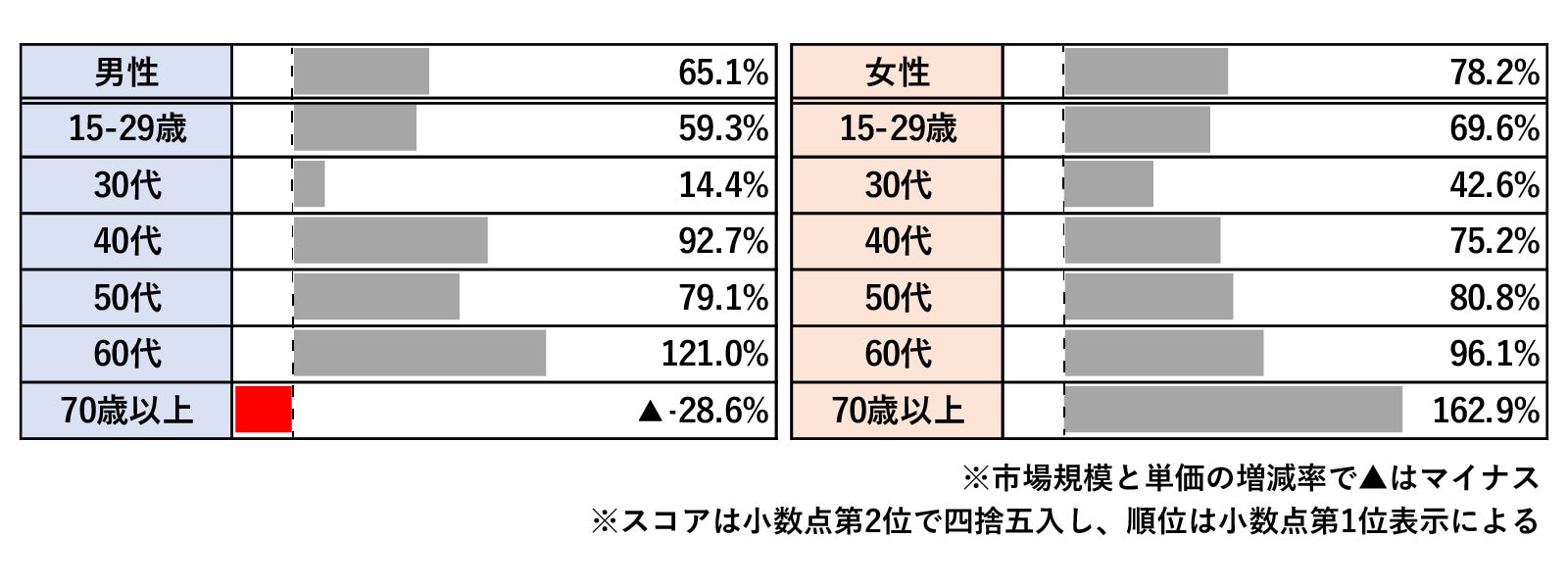 性別や年代別のデータでは、男性全体で前年比65.1%の増加を示し、特に男性40代から60代での増加率が際立っています。男性60代は121.0%、40代は92.7%、50代は79.1%の増加を記録し、同様に女性も78.2%の増加が観察されています。【図表4】