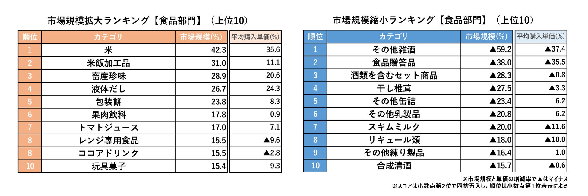 - 食品部門では、「米」が前年比42.3%の増加を記録し1位を獲得。続いて2位にはパックご飯の「米飯加工品」がランクインしています。また、切り餅の「包装餅」が5位に入るなど、コメ関連商品が上位に名を連ねています。