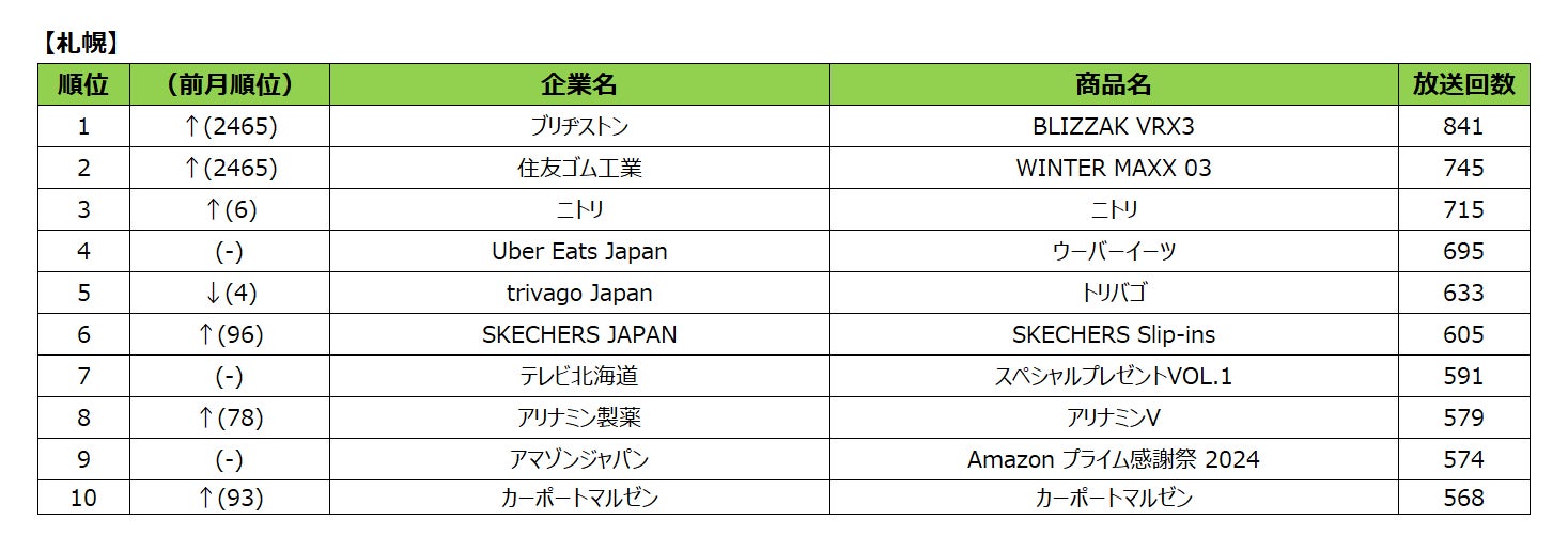 札幌エリアにおいては、冬用のスタッドレスタイヤが先月に引き続き大幅に順位を上げて、1位と2位を占めました。これは地域の特性を反映した結果と言えるでしょう。