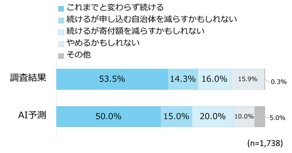 • 継続意向:AIの予測では、ふるさと納税ポイント付与の廃止後も寄付を続けるつもりであるとしたのが50%で、実際の調査結果とほぼ合致していました。