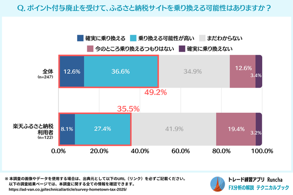 ポイント付与廃止による乗り換えを検討するユーザーは49.2%でしたが、楽天のふるさと納税ユーザーに限ると、その比率は35.5%にとどまり、全体よりも明らかに低いことが分かりました。