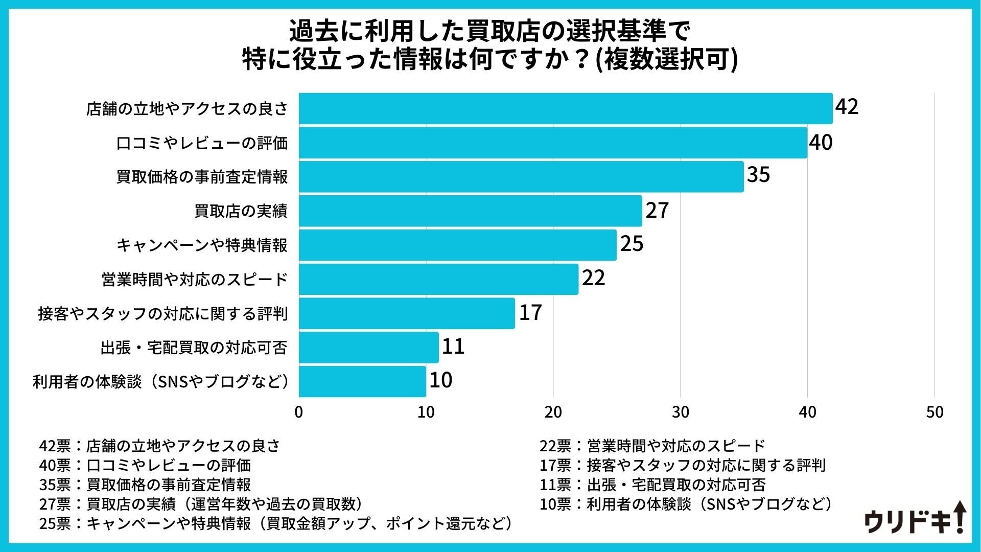 さらに過去の買取店選択に関して、特に参考になった情報は「店舗の立地やアクセスの良さ」でした。その次に「口コミやレビューの評価」、「事前査定に基づく買取価格」が挙げられました。