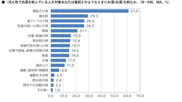 冷え性を自認し白湯を飲む人にいつ白湯を飲むか聞いたところ、「朝起きた時」が61%で最も多く、次に「寝る前」29.3%、「家庭でくつろいでいる時」26.4%、「朝食時」21.1%と続く結果が出ました。昼夜を問わず白湯を楽しむ傾向が浮き彫りとなっており、「寒さを感じるとき」や「体調がすぐれないとき」にも白湯を用いるとの意見が多く見受けられました。