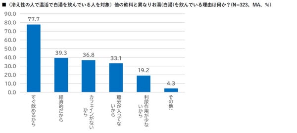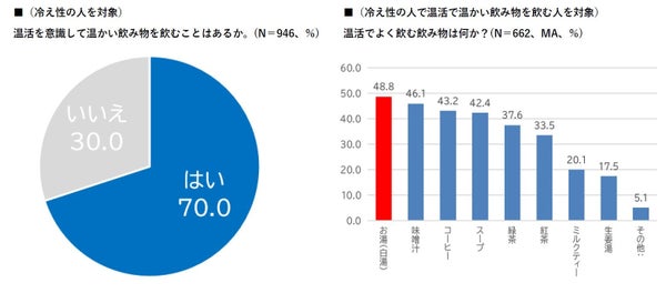 冷え性を感じたことがある人に温活を意識している際に温かい飲み物を飲むかという質問をしたところ、70%が「はい」と回答。飲まれる飲料は、「白湯」が48.8%、次いで「味噌汁」が46.1%、「コーヒー」が43.2%、「スープ」が42.4%との結果が読み取れました。特に「白湯」は20代で54%の利用があり、その理由として「すぐ飲める」「経済的」「カフェインフリー」「糖分を含まない」といった意見が寄せられました。また、白湯を愛飲する人々を「サユナー」と称することが確認されました。