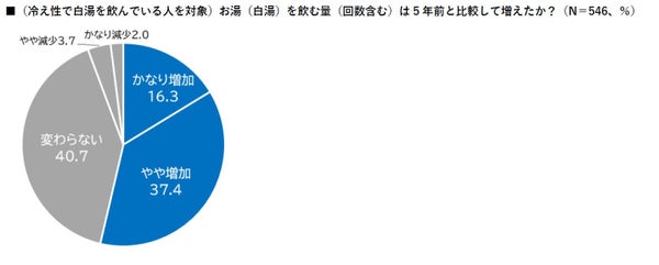 白湯を飲む動機については、「冷えた身体を温めるため」が53.8%、「健康維持のため」が46.9%との結果が得られ、単に身体を温める目的だけではなく、健康を意識する傾向も示唆されています。「美容」「リラックス」「水分補給」を意図して飲まれることが多く見られ、白湯を飲む頻度を5年前と比較した場合、53.3%が「増えた」と回答しました。