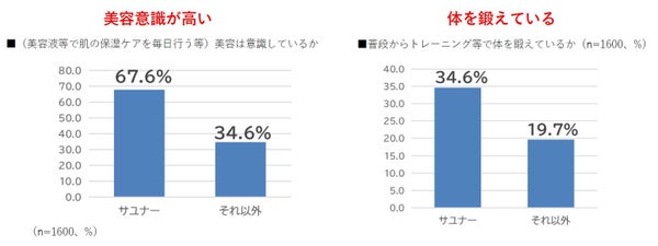 サユナーとそれ以外のグループの健康に関する意識を比較した結果、サユナーは美容への意識が特に高く、毎日のスキンケアやトレーニングを行なっている人が多く、良質な睡眠の確保にも気を使う傾向が伺えました。このような健康意識の高い層において飲用者の拡大が進んでいると考えられます。