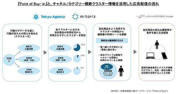 東急エージェンシーとmitorizの共同開発によるマーケティングダッシュボードサービス「Point of Buy-α」と、東急エージェンシーが開発した購買・行動分析ツール「Target Finder®」が融合し、ユーザーの購買行動クラスターデータとUNIVERSE Adsが連携します。