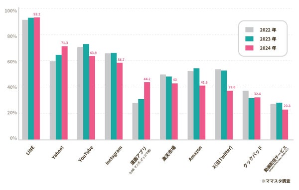 株式会社インタースペース(本社:東京都新宿区、代表取締役社長:河端伸一郎、証券コード:2122)が運営するママ向け情報サイト「ママスタ」が、「アプリ・ネットサービスランキング2024」を発表しました。このランキングは、2013年から11年間連続で実施されており、各年の最も利用されたアプリやネットサービスの調査結果をまとめています。また、2022年度版(2022年12月14日~12月21日調査)と2023年度版(2023年11月20日~12月7日)の利用状況を比較し、ママたちの利用傾向の変化を明らかにしています。