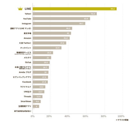 調査の結果、育児中のママたちが最も利用しているアプリは「LINE」で、93.2%の利用率を記録し、11年連続で1位となっています。続いて「Yahoo!」(71.3%)や「YouTube」(63.9%)が上位に入り、連絡や情報収集に役立つツールが多く選ばれています。また、「Instagram」(58.7%)や「漫画アプリ」(44.2%)なども多く利用されており、ママたちが実用性と共に気軽に楽しめるコンテンツを重視していることが分かります。