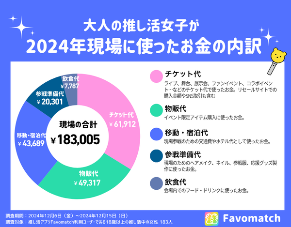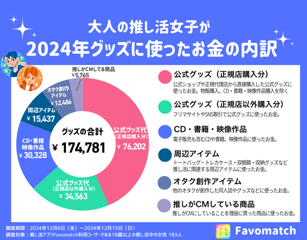 株式会社Favosiaが提供する18歳以上の女性専用推し活アプリ『Favomatch』では、ユーザーを対象に『2024年の1年間に推し活へ使ったお金』についてのアンケート調査を実施しました。