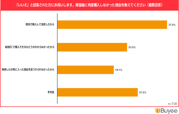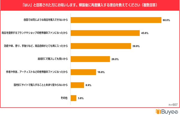 旅行中に購入した商品やブランドを越境ECで再購入した経験者は44.0%。その理由には「自国では購入不可能なため」や「ブランドやショップ、商品のファンになったため」が含まれています。