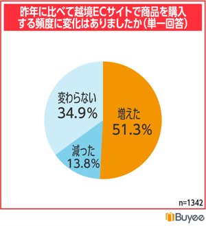 1回あたりの購入金額については、「5,000円~1万円未満」が最も多く、また60.2%が1万円以上を購入していることが明らかになりました。2024年の越境EC利用頻度は51.3%が「増えた」と回答しており、利用拡大の傾向が見受けられます。