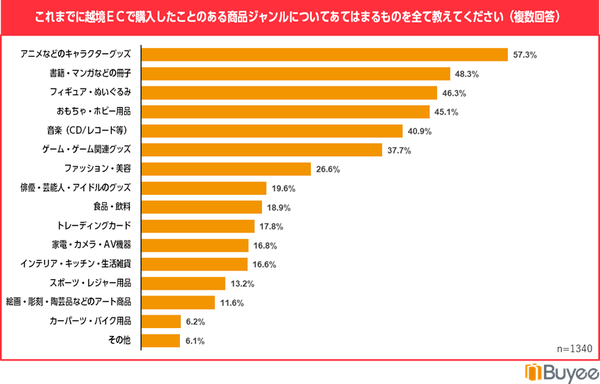 越境ECでの購入商品分野は多岐にわたり、特に「アニメやキャラクターグッズ」が57.3%と最多でした。