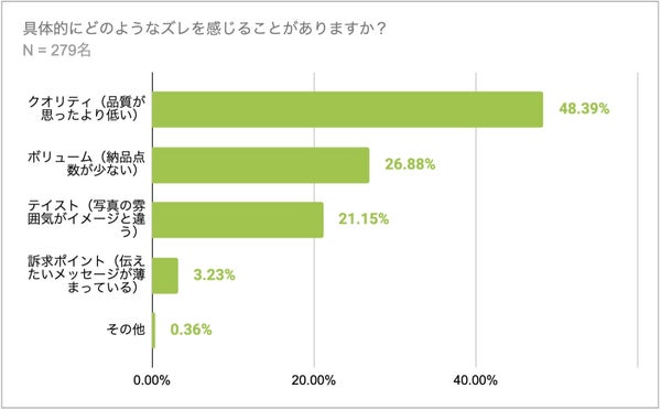 イメージのズレに関しては、「クオリティ」が48.39%で最も多く、次いで「ボリューム」(26.88%)、「テイスト」(21.15%)という結果が出ています。