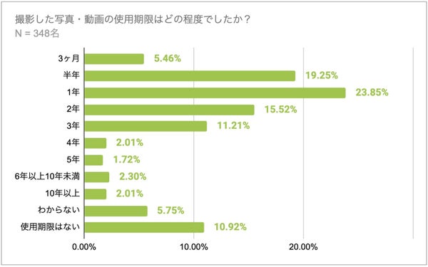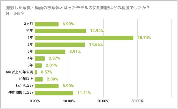 人物モデル使用による撮影に関する使用期限についての調査で、最も多かったのは「1年」で23.85%を占め、この結果、1年未満の使用期限が約50%、75%が3年以内となることが示されました。