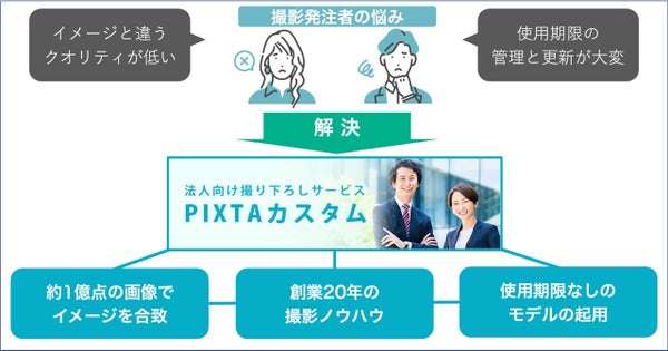 国内最大のストックフォトサイト「PIXTA」が展開する法人向け撮影サービス「PIXTAカスタム」は、企業が必要とする写真・動画を「使用期限なし」で撮影し、「イメージ通り」に提供することが特長です。