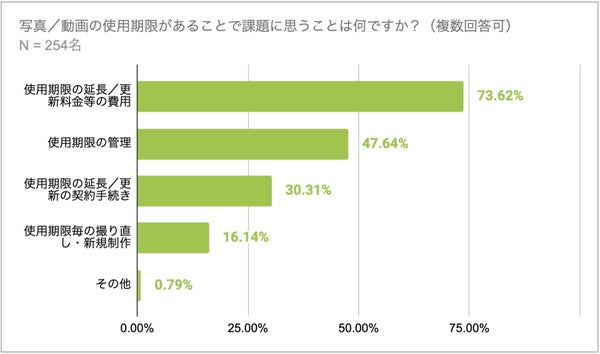 具体的には、「使用期限の延長や更新料金の負担」が73.62%で最多、続いて「使用期限の管理」に対し47.64%が課題を感じています。