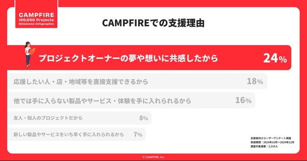 支持されるプロジェクトとしては、「エンタメ」が約400万件と最多で、次に「地域・まちづくり」や「ビジネス・起業」においても、多くの共感や応援が寄せられています。ユーザーアンケートによると、支援理由として「夢や想いへの共感」が最も多く挙げられました。