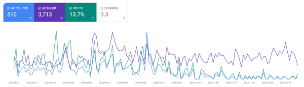 次のグラフは、このキーワードによるクリック数や表示回数、CTRの推移を示しています。