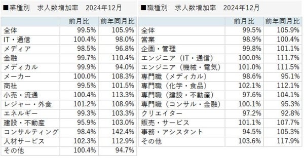 12月の求人数は前月比で若干の減少が見られましたが、前年同月比では引き続き増加の傾向を維持しており、高水準です。「人材サービス」業界では、高いIT・DX人材の需要が影響し、特に技術系アウトソーシング企業での求人数が増加しています。自動車や半導体分野のエンジニア、アプリエンジニアの求人も増え、「人材サービス」の転職求人倍率は2019年1月以降初めて10倍を超える結果となりました。転職希望者数は毎年この時期に減少する傾向があり、今回はその傾向が顕著で、求人数よりも転職希望者数の減少が大きく、転職求人倍率は上昇しています。